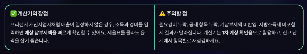 | 계산기 사용 | 빠른 예상세액 확인 | 입력 누락 시 오차 발생 |